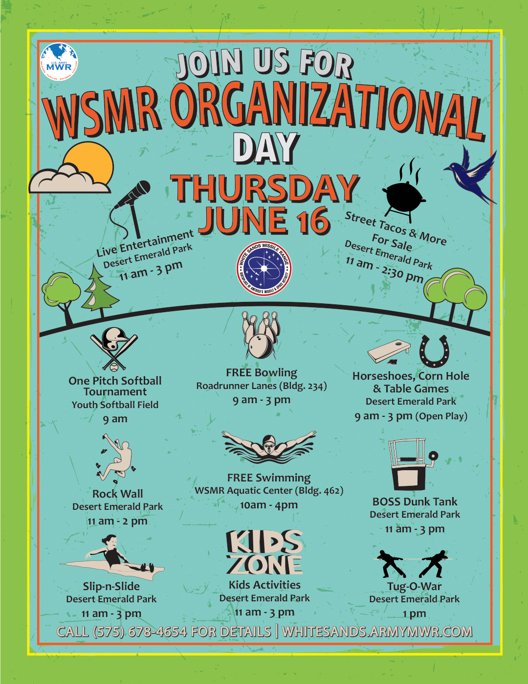 Calling all organizations on White Sands Missile Range! It's time to get out of the office and come to Volunteer Park and enjoy some great food, drinks, music, and games! There will be individual contests being held where you could win cool prizes! There are also activities for both adults and kids! Something for everyone!